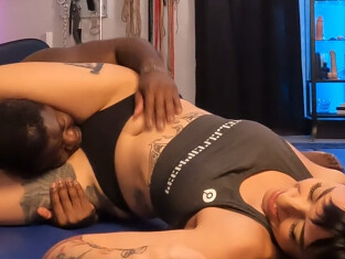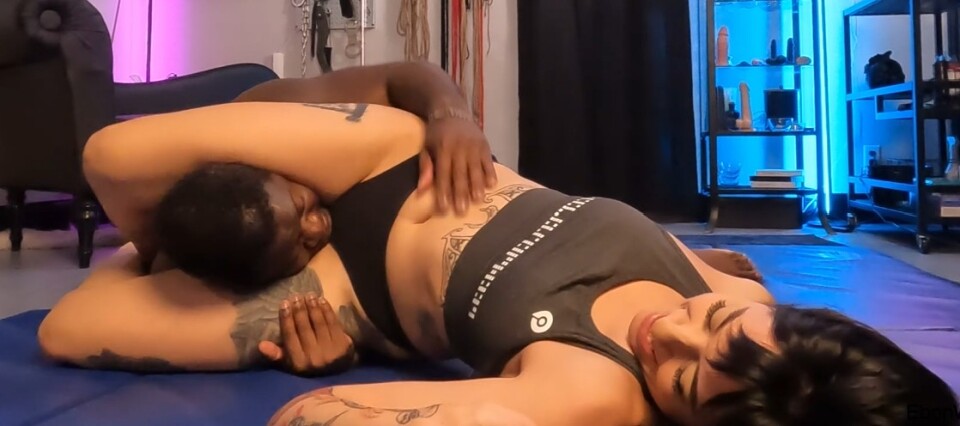 Ebon hasn't been giving Bri the attention she needs lately, so she grabs his focus by taking down to the mats for little play-wrestling. He eventually gets serious and starts placing her in holds and pins of his own, but Bri is just too relentless today and he gives up. She then demands that he worship her belly button as a reward, to which he agrees to do.